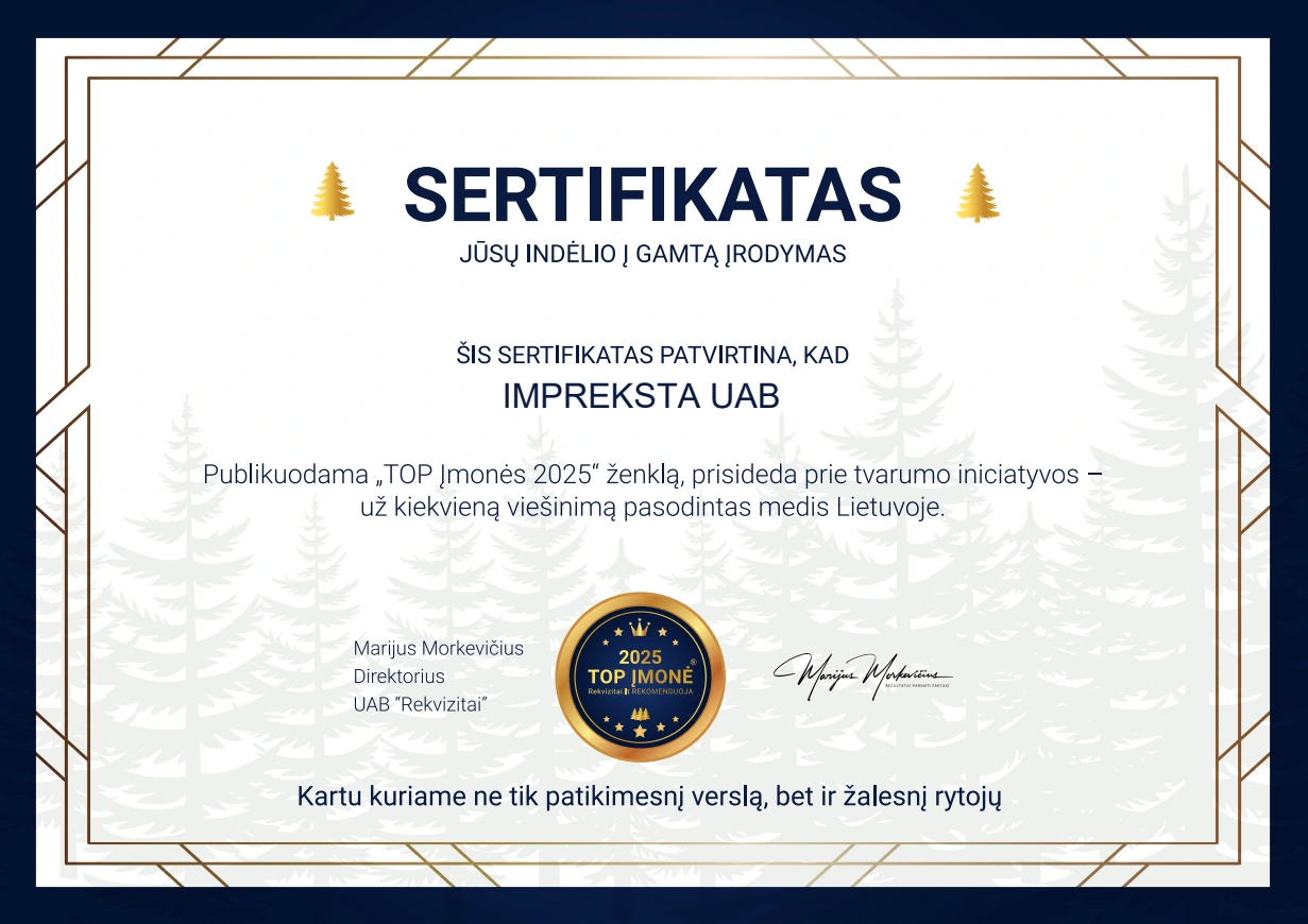 „Rekvizitai.lt“ įvertino UAB IMPREKSTA kaip vieną iš TOP įmonių Lietuvoje 2025 metais – šis statusas suteikiamas tik 6 % bendrovių, pasižyminčių patikimumu, finansiniu stabilumu ir atsakingu verslu. Šis ženklas patvirtina mūsų skaidrią veiklą, tvirtą reputaciją ir augimo potencialą, o prisijungdami prie iniciatyvos už kiekvieną viešinimą prisidedame prie miškų atkūrimo Lietuvoje. Žemiau pateikiami oficialūs sertifikatai.